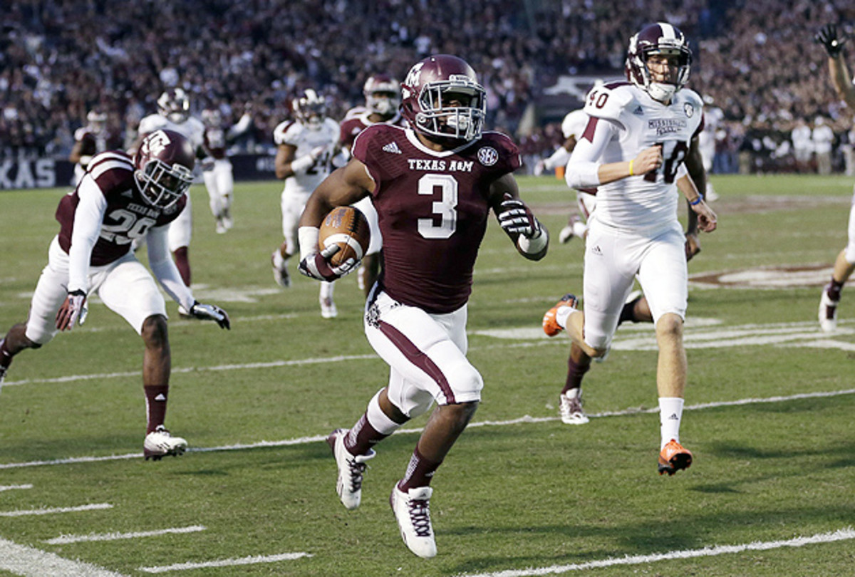 Which brings up the second question. What can Williams’s experience tell us? For that, there are two plays to which to point. The first and more glamorous comes from A&M’s game at Ole Miss on Oct. 12, 2013. With the score tied 7-7 late in the first quarter, Williams took a handoff, broke left, cut right, hopped left and then jump-cut back to the right, confounding five would-be tacklers en route to a score. His footwork was impeccable—a rapid succession of devastating moves Williams has become known for in the open field. “What Trey Williams did, people were saying it was Barry Sanders-like,” Malena says. “I don’t say it was Barry Sanders-like. I just say that was Trey Williams-like. That was just sick.”