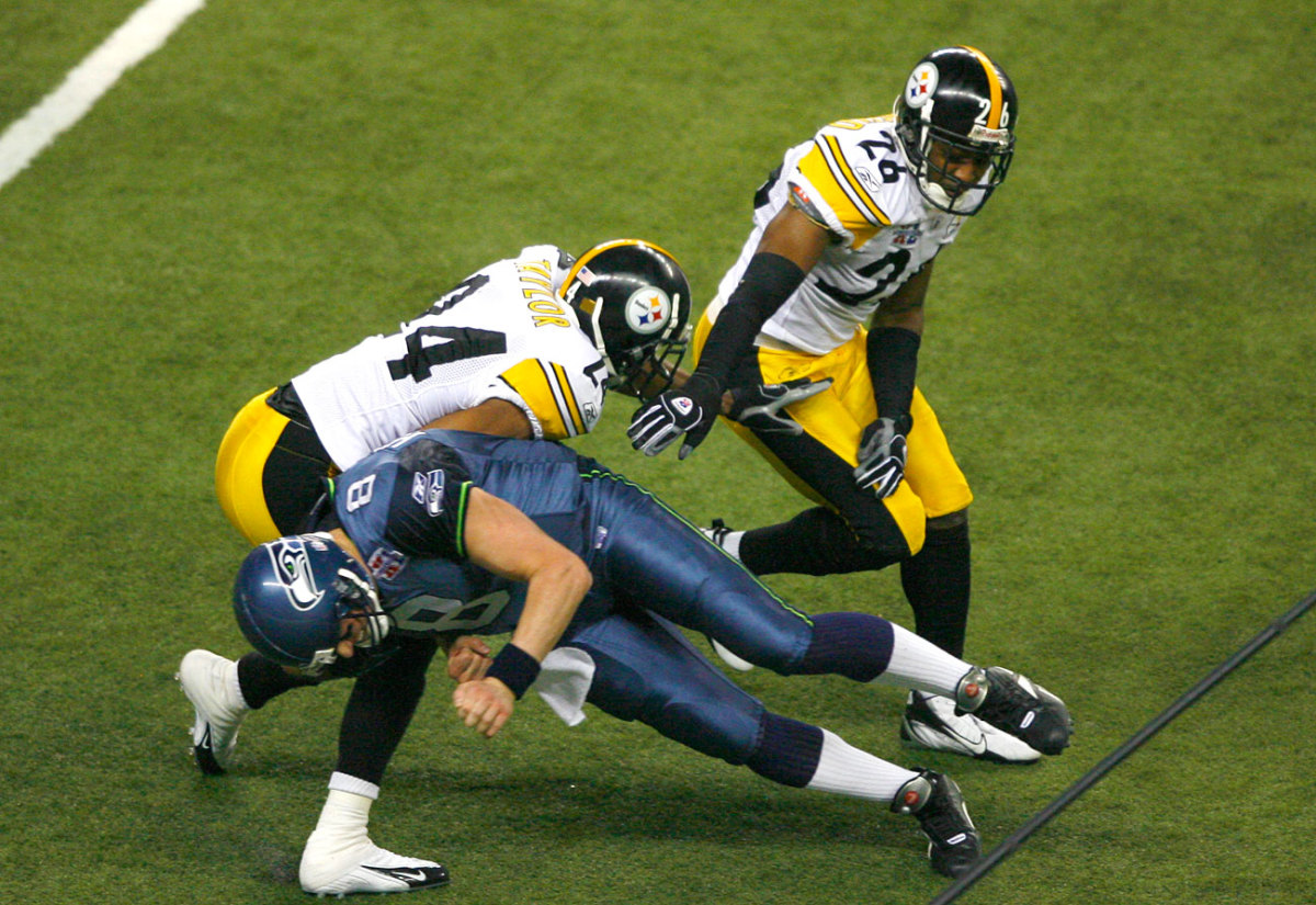 In Super Bowl XL, at 10:54 of the fourth quarter, Hasselbeck was intercepted by Ike Taylor and subsequently flagged for going low during a return.