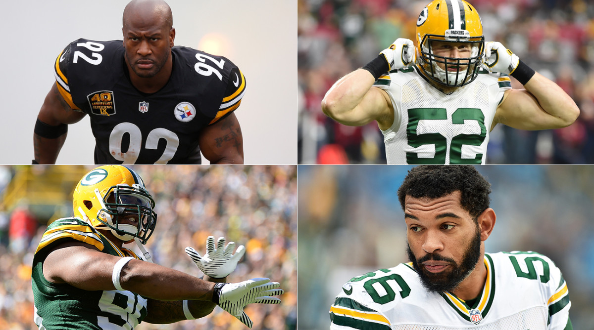 Clockwise, from top left: James Harrison, Clay Matthews, Julius Peppers and Mike Neal / Getty Images (4)