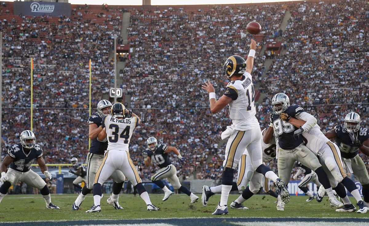 1. Challenges are in front of the Rams in Los Angeles. Rams COO Kevin Demoff isn’t under the illusion that the team can just swing open the gates to the Coliseum and expect what they got last Saturday night every week without working at it. But to him, even after you wipe away the novelty, there was plenty to take from the first-night experience. “What sticks out to me is that it’s rare you pay attention to crowds in the fourth quarter of a preseason game,” Demoff said Monday. “But we had a loud, passionate crowd that propelled a comeback. That wasn’t the casual fan there to see the pregame stuff and kickoff. That was an excited, passionate fan, there cheering on Sean Mannion, Nelson Spruce, Aaron Green and Ian Seau. That’s when you thought, This is really cool and there’s so much room to grow. … There was so much excitement and energy. Of course, kickoff gave you chills and it was emotional for all of us. But the true test was looking in the fourth quarter, and seeing 60-70,000 fans still on their feet cheering. There’s some thing special here; we have to find a way to sustain it.” Now, the challenge there is the three-year runway in front of the Rams to get their Inglewood palace. There’s a decent chance that the newness of it all carries the team through 2016. In 2018, it’ll be the Coliseum’s last hurrah as an NFL venue, and a lookahead to Inglewood. So 2017 figures to be the pivotal year, where the Rams aren’t brand new anymore and the new stadium is still away on the horizon. The club also acknowledges that—given the competition in a market with eight pro teams, two major colleges and an endless array of entertainment options—they’ll have to compete for the consumer’s dollar in a market full of people who’ve been conditioned for two decades to watch the NFL from their couch. But as they see it, the reward here, if they can find a way to do it right, is off the charts. As Demoff put it, “Modern-day Los Angeles and the modern-day NFL really have a chance to combine to create something spectacular.”