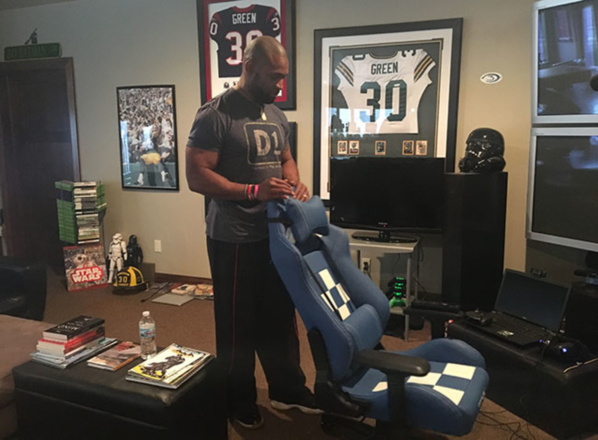 A decade and a half later, Green, 39, is in a new home, but his basement has barely changed. The elaborate setup still reflects the life of a well-rounded nerd. On top of being a serious gamer who schedules at least an hour a day of video game “practice” on his iPhone calendar, Green is also a comic book enthusiast, particularly Batman. His own Batcave has three screens and a leather gaming chair complete with lumbar back support. The shelf behind his chair is lined with game balls from his NFL career. Figurines—Harley Quinn, Luke Skywalker—stand atop each ball.