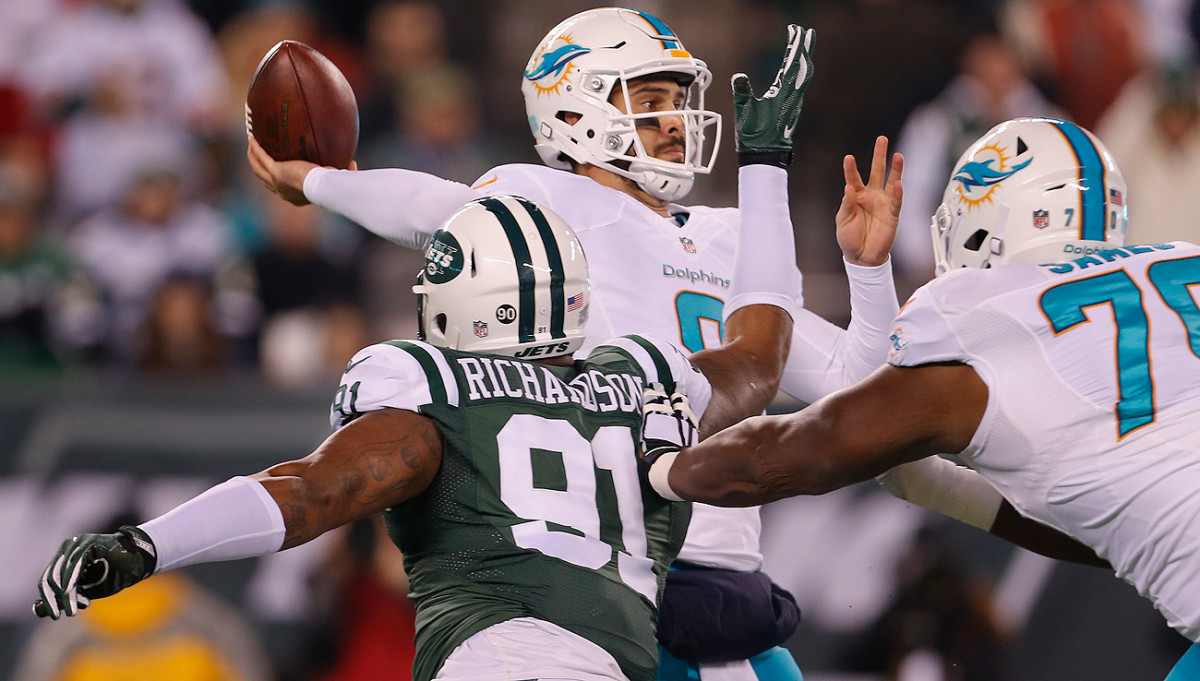Matt Moore, quarterback, Miami.In nine years as an NFL backup (mostly), in 46 games, Moore had never had four touchdown passes in a game—until Saturday night. And this was his first start in almost five years. “There was some nerves,” he said. Not for long. Moore hit tight end Dion Sims twice from a yard out, and threw one lovely deep ball in stride to the streaking Kenny Stills (52 yards) and another tight throw to Jarvis Landry (66 yards), all in the first 40 minutes of Miami’s surprisingly easy 34-13 win over the Jets. For the game, Moore was 12 of 18 for 236 yards and a rating of 126.2. Not bad for a guy who’d been in mothballs behind Ryan Tannnehill.