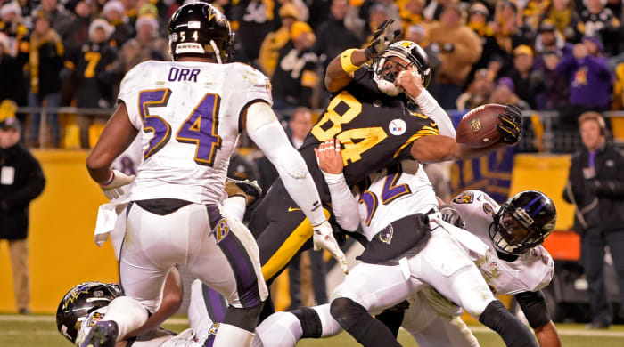 The Steelers took over at the 25-yard line, and Bell said to Brown: “A.B., you gotta go down there and get the game-winner.” Seven completions, two timeouts, two clock-killing spikes, and here came that chance. Pittsburgh had no timeouts. They could either take two shots into the end zone, or one shot in the field of play knowing they’d have to spike it quickly, or run once and then spike it. Roethlisberger threw an incut to Brown, who caught it at the Baltimore one-and-a-half, nowhere near a sideline.