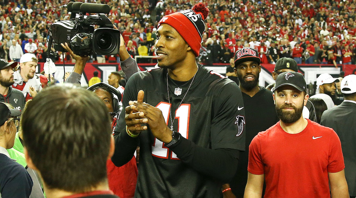 The party continued all around Howard on the field. In between selfies, the 6'11" hoops star, who was wearing a black No. 11 jersey, tabbed Jones as the best receiver in the NFL. Fellow hoopster Dikembe Mutombo wagged his finger, and actor Samuel L. Jackson waved a towel. Jones’s mother—the one with “JULIO’S MOM” stitched across her No. 11 jersey—inched through the celebration toward her son. As she wrapped both arms around him, Howard told SI.com, “I told everybody the Falcons were going to the Super Bowl.” If that seems awfully convenient, Howard then doubled down, adding that he picked the Patriots as their opponent.