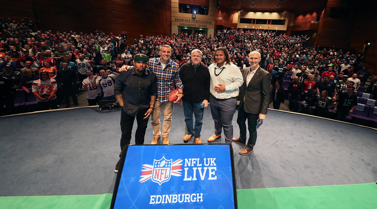 This photo was taken last Thursday evening in Scotland, at the Edinburgh International Conference Centre, when NFL UK, the league’s overseas organizational arm based in London, put on the last of four programs (or programmes, if you may) to bring the game to fan bases in London, Liverpool, Nottingham in England and, finally, Edinburgh in Scotland. I was there to document the trip, and the curiously strong knowledge of these fans, for a future story. On the way, I told a few yarns as part of the panels, hosted by Neil Reynolds of Sky Sports, along with Miami receiver Jarvis Landry, Washington quarterback Kirk Cousins, Hall-of-Famer-to-be Kurt Warner, retired receiver Steve Smith Sr., and Cleveland defensive tackle Danny Shelton. (Reynolds hosted all four evening events at various downtown theaters/venues; the players cycled through, appearing at two or three of them each.)