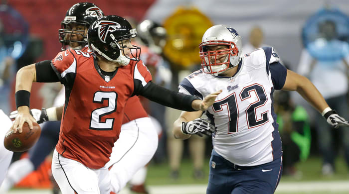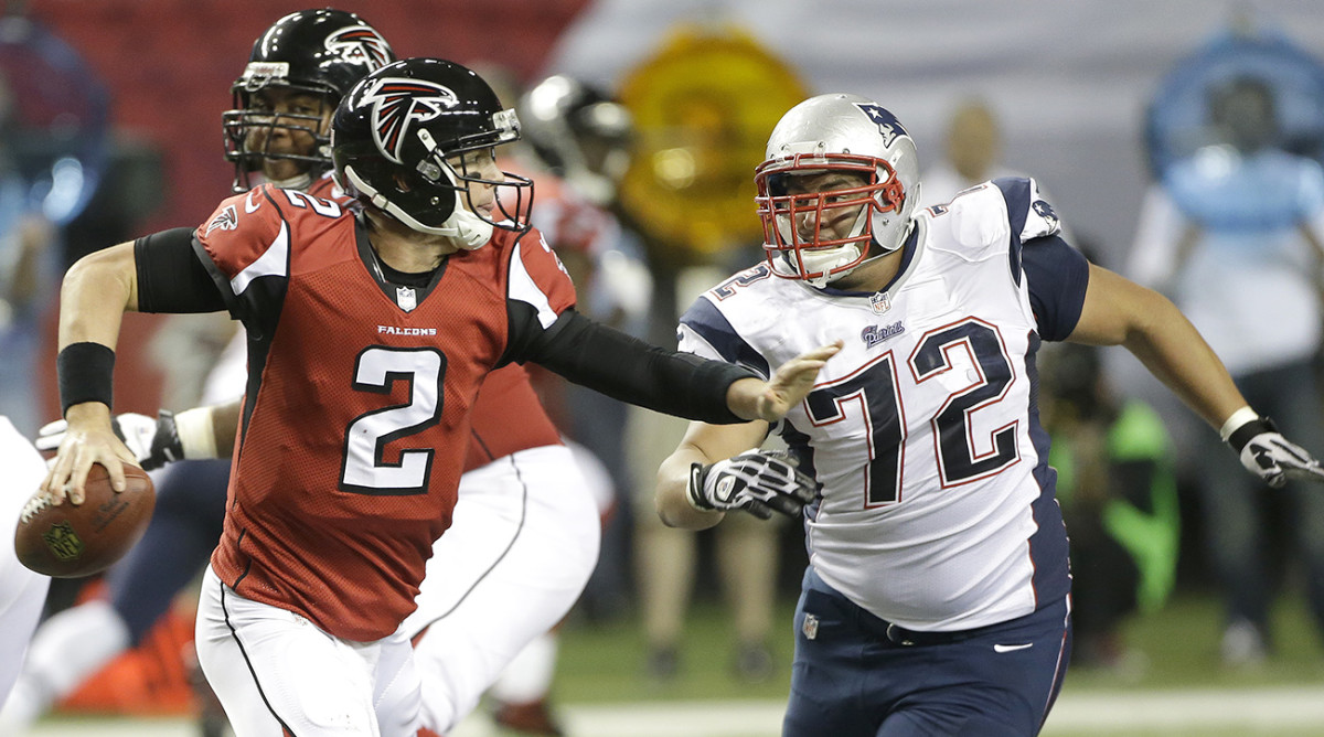 Months after the Super Bowl, Vellano is still thinking about a play in the second quarter, the series right after Tom Brady threw a pick-six. He and Vic Beasley were running a stunt, and Vellano picked the guy blocking Beasley, while Beasley looped around to get in Brady’s face. Beasley hit Brady as he threw, and the pass wobbled—but the play still resulted in a 15-yard completion to Martellus Bennett. Could they have done something else to change the trajectory of that play by just a few inches? “Sick on that one,” Vellano mumbles.