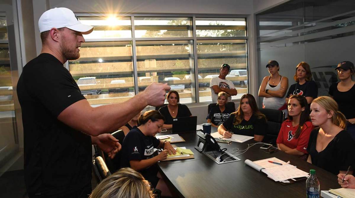 Six days later in Houston, Watt met Texans employees and volunteers at Lightning Logistics to plan a relief supply drop the next day at four locations across the city, an effort independent of his fundraising. Standing in a packed conference room at 6:30 p.m., Watt laid out the specifics of the plan: There would be food, water and sports drinks, and general supplies like kitchenware and candles. He preferred a drive-through arrangement, with Texans players and volunteers loading up cars as they came by. These aren’t the details you’d expect to see All-Pro defensive ends poring over a week before the start of the season.