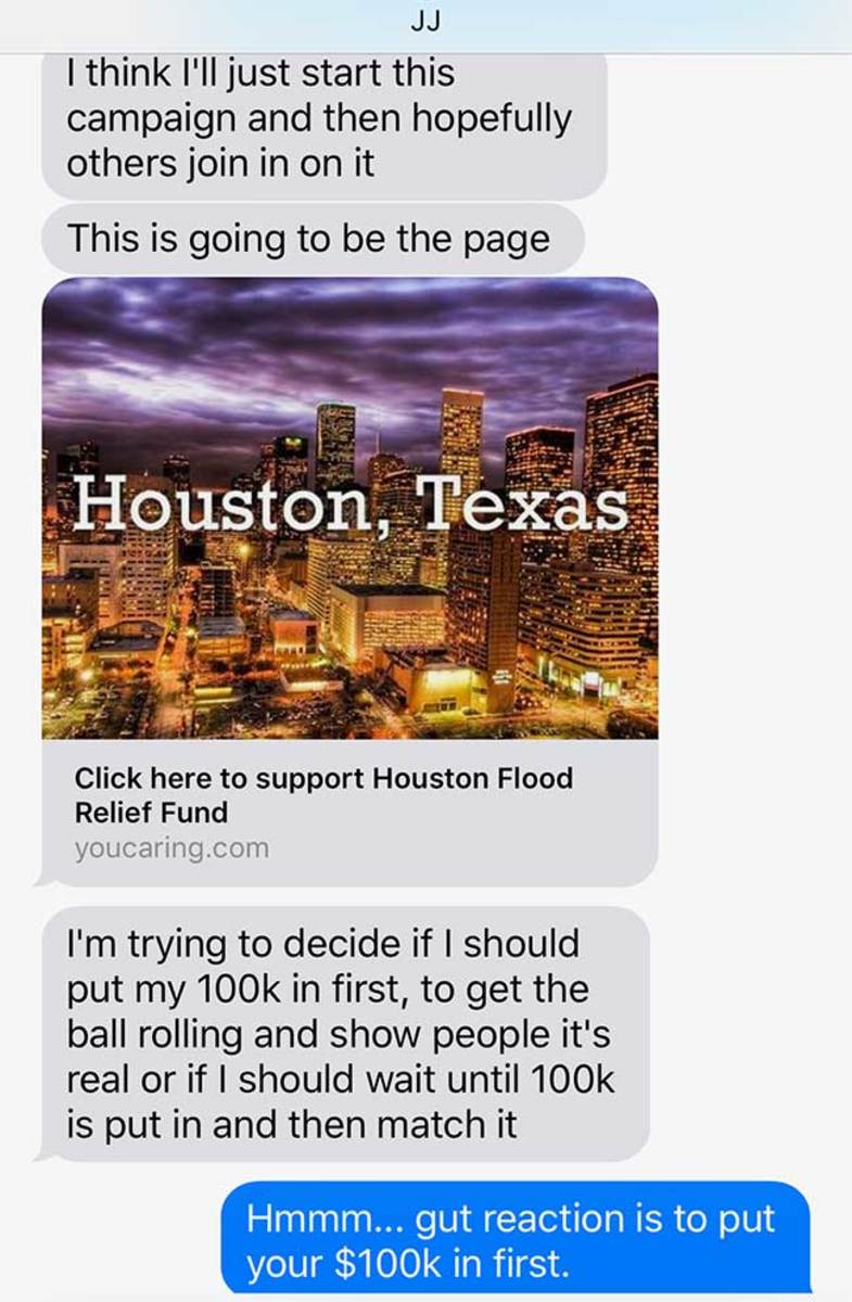 Nine days later, the relief fund for the greater Houston area has blown past the original goal of $200,000, of which Watt contributed the original $100,000, and as on Tuesday it surpassed $20 million. Teammates pitched in. Houston Rockets guard Chris Paul pushed the fund over half a million dollars. Drake contributed $200,000. Ellen DeGeneres pledged $1 million. During the initial push that Sunday night, the rapid contributions overwhelmed You Caring’s bandwidth and crashed the site. Texans media relations staffers sat with Watt in a meeting room in a Plano hotel and scrambled to get hold of the site’s CEO. ESPN sports business reporter Darren Rovell provided five possible phone numbers for Dan Saper in San Francisco. One of them worked. Saper woke up and roused engineers to fix the problem, “and he’s been unbelievable ever since,” Watt says.