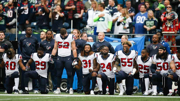Most players on the Houston Texans knelt and linked arms during the national anthem prior to their game against the Seahawks on Sunday.