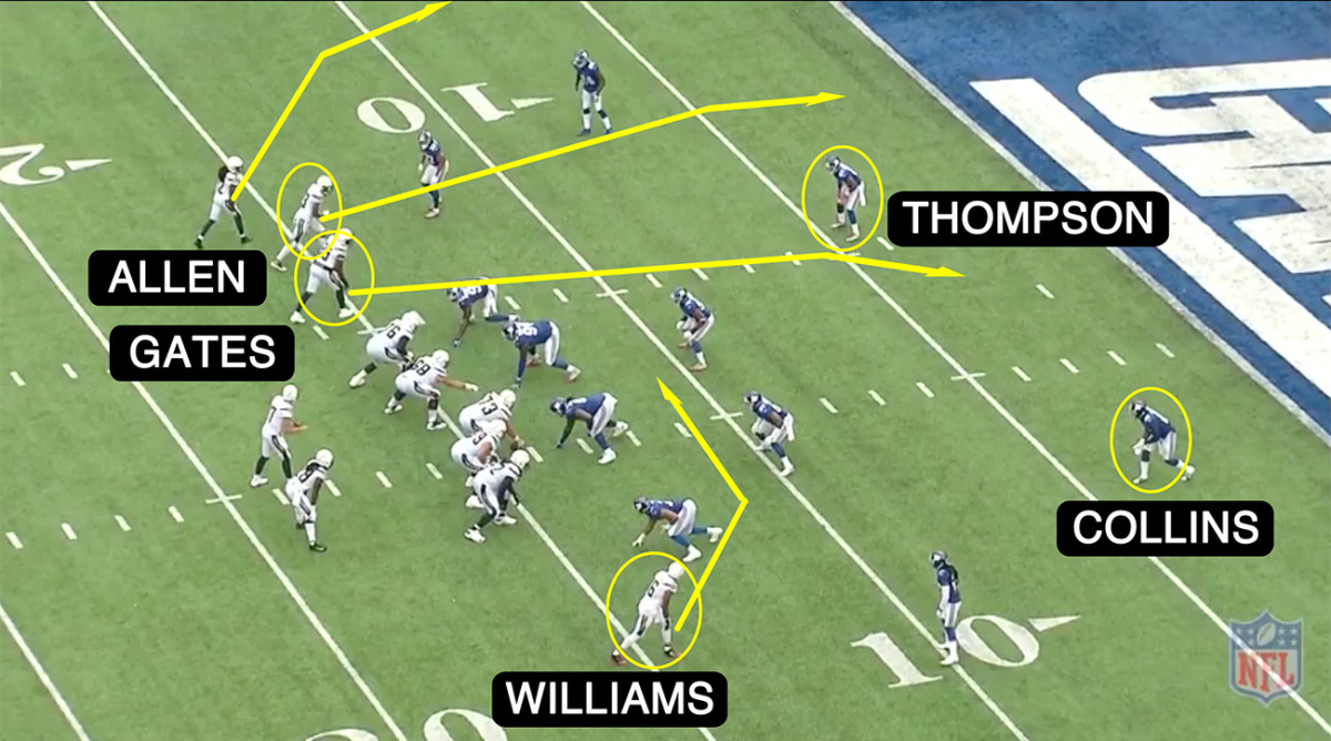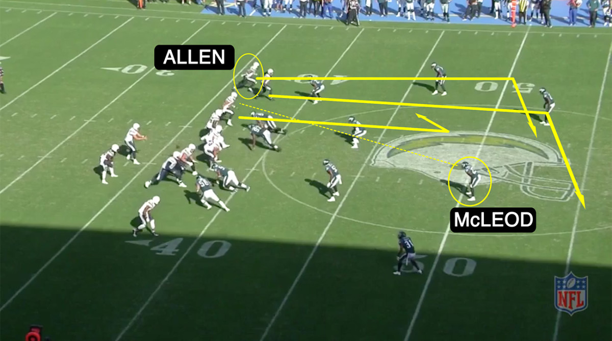 McLeod leaves his zone and drives so hard on Henry’s route that he practically busts the coverage. Rivers waits and hits Allen on the wide-open in-breaker. “I like to complete these in-routes out wider than this normally. Because you’re not quite sure what you got back in the secondary.”