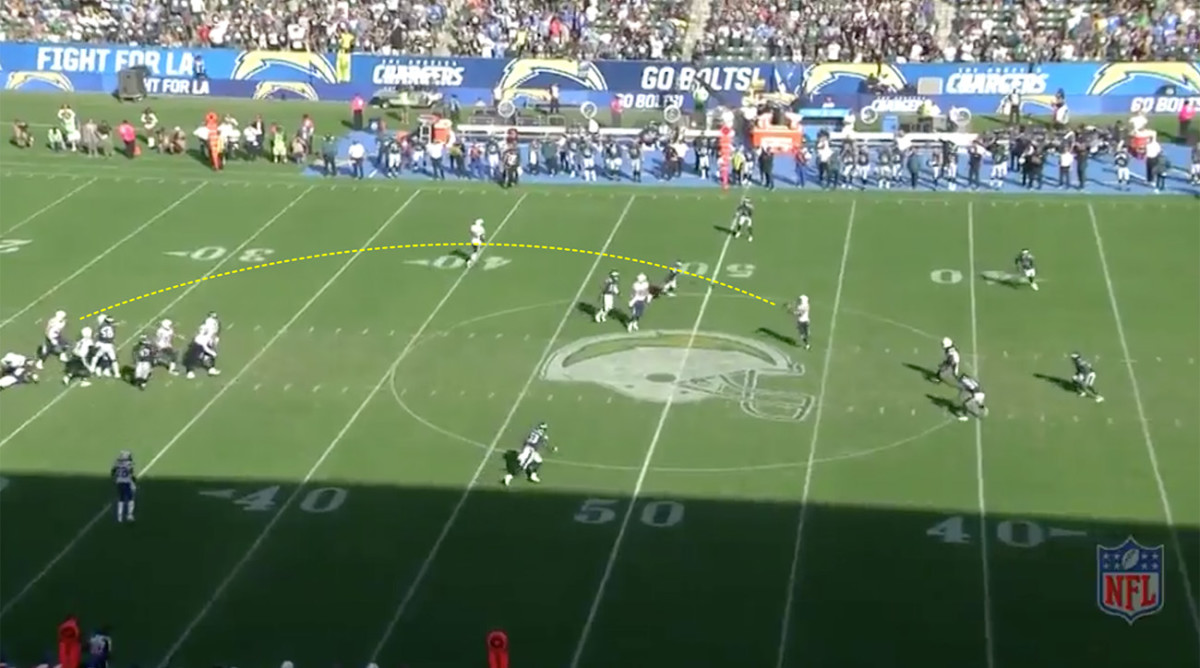 For the next play, we pull up another long completion against a two-deep safety look: Keenan Allen’s 50-yard catch near the end of the Week 4 Eagles game.