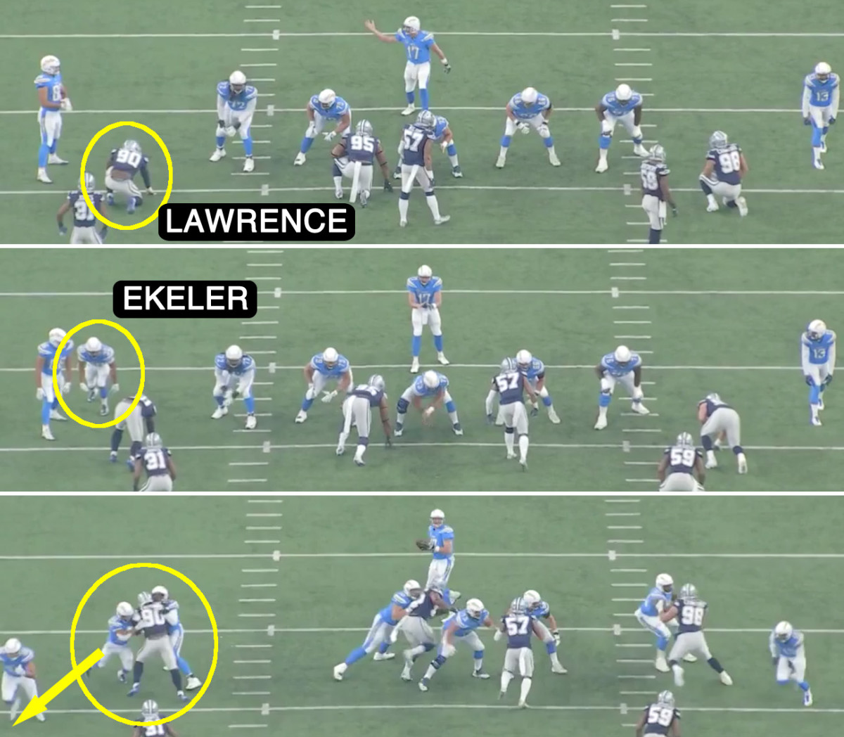 Then Rivers called running back Austin Ekeler into the formation so he could chip-block stud defensive end DeMarcus Lawrence.