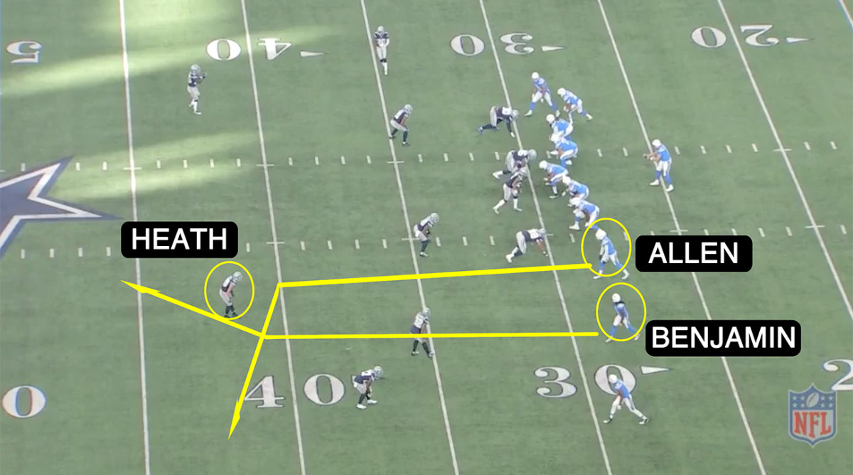 “We’re running scissors with [Keenan Allen and Travis Benjamin], which is pretty simple. Dallas played a 2-high coverage with both Quarters and Cover-2 principles. Safety [Jeff Heath’s] width suggested we could get Travis over the top on this thing. It was Thanksgiving so we didn’t have much time to prepare. But we did talk about whether we might get this coverage. We’d get Travis running right down the middle.”