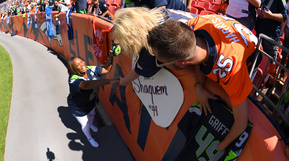 “Mama Griffin! Mama Griffin!” Zack and his mom Jamie are shouting in unison now. She runs over and grabs their hands, beaming as she sings “Hellooooo!” He says he was born with the same condition as Shaquem—amniotic band syndrome—and she reaches over and grabs his amputated nub and shakes it the way you’d only shake a stranger’s nub if you’d held one dear to you before. “I know,” she says. The tickets were Zack’s 22nd birthday present, but they’re supposed to be sitting in the upper deck, section 534. They finagled their way to the front row closest to the field an hour before the game to see Shaquem. Jamie reached out to Tangie five years ago, on Facebook, when Shaquem’s story started making waves, and told her what an inspiration her son was. Tangie replied and thanked her, though neither of them counted on all this. The NFL. The Nike campaign. The Gillette shaving ad. The starting nod at linebacker as a rookie. It’s a lot.