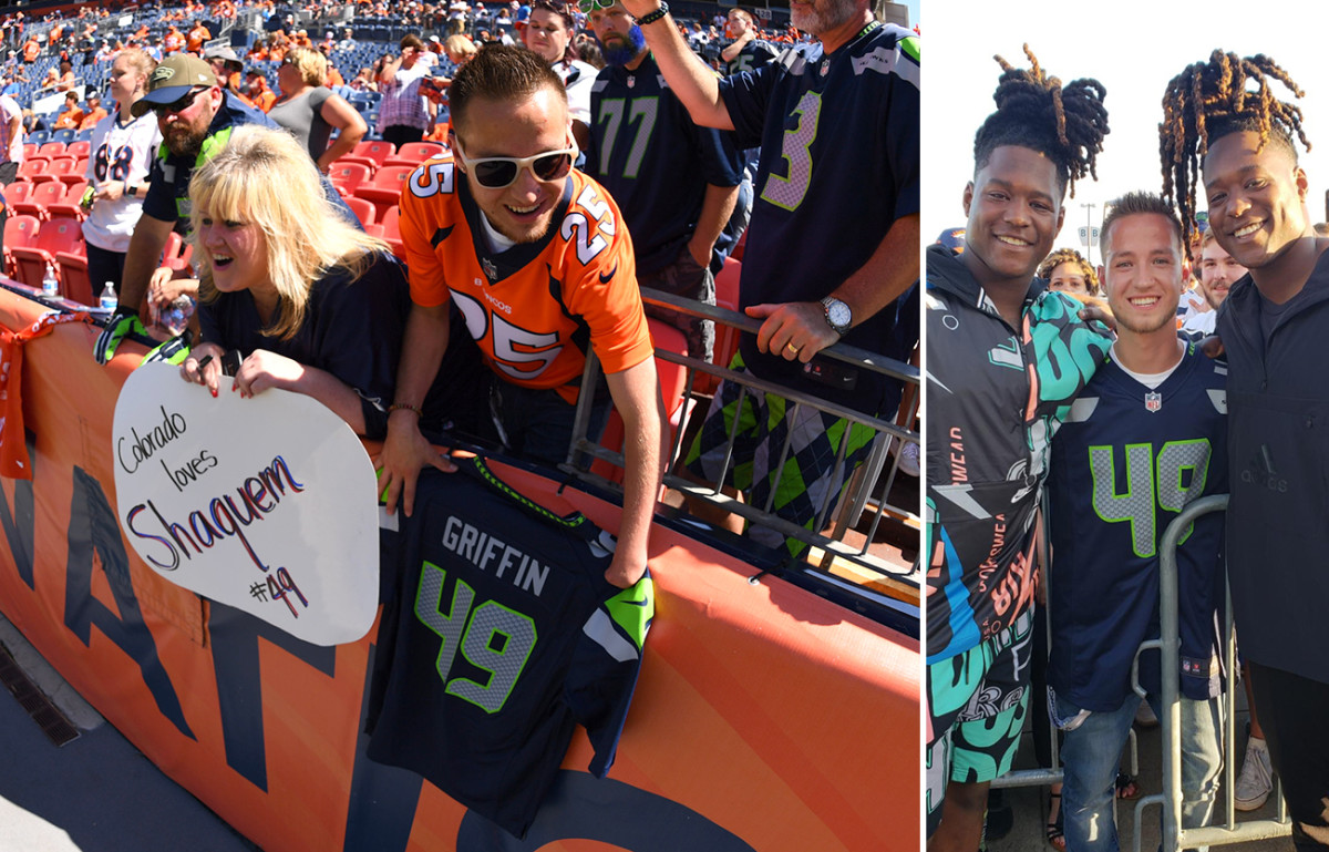DENVER — She knew they’d come. The place was big, and she was small, and there was a world of noise and bodies around her and around them, but she knew they’d come. Tangie Griffin, aka Mama Griffin, had pregame field passes to watch her twin boys Shaquill and Shaquem warm up before the season opener, Shaquem’s NFL regular season debut. Fireworks and introductions were coming soon, and the Seattle Seahawks were headed to the locker room, the Griffin twins among them. But they spotted Mrs. Griffin waving her arms on the sideline and made a beeline for a pair of hugs. She held them close and after a moment let them go, then she covered her mouth with her hands. Focusing her attention on the rookie, she kissed her hands and shook all over as she sent love his way. Then he was off, into the fray once more, minus one appendage we all assumed was required to play pro football until the first time we saw Shaquem Griffin.