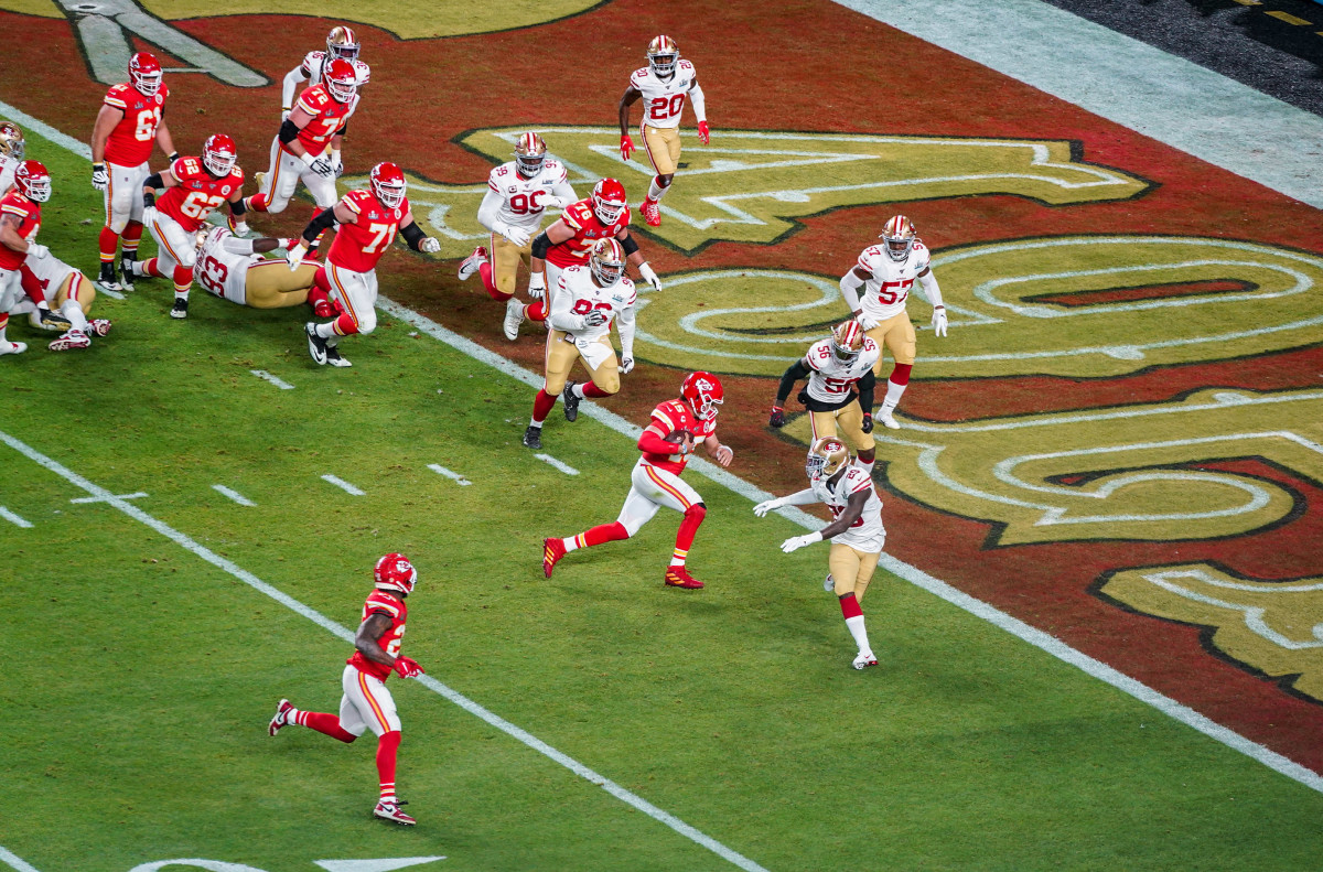 The Chiefs called a play they’d deployed last season, against the Patriots in the playoffs. For most of Sunday, Mahomes would explain later, the 49ers’ defense had been playing a robber coverage, where the safety came down to “rob” K.C.’s deep crossing routes. On this down, Chiefs tight end Travis Kelce stutter-stepped before crossing the field. Meanwhile, Tyreek Hill ran what they call a Detroit route: Lined up in the slot, he faked a post and, when he hit the hash mark, cut back outside. As he turned back out toward the corner, San Francisco’s DBs lost track of him. Pass rushers clobbered Mahomes on that play, but he managed to heave a 44-yard pass, the high-arcing throw allowing Hill plenty of time to settle under it at the 49ers’ 21. The pass changed everything.