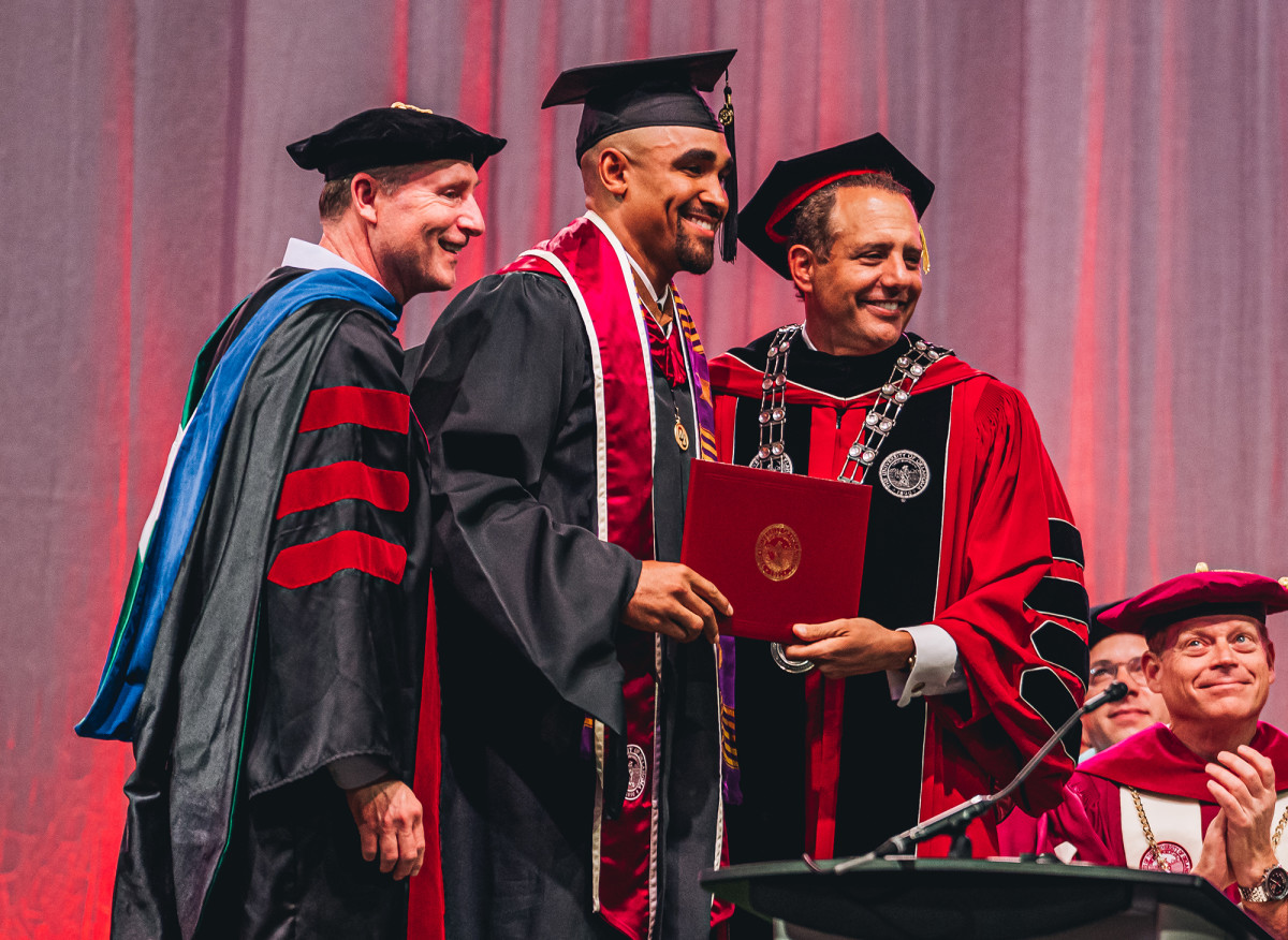 Harroz pivots to the one subject sure to unite his eager audience. It’s football, naturally. “Tonight, he becomes a master’s graduate. Please join me in congratulating . . . Jalen Hurts!”