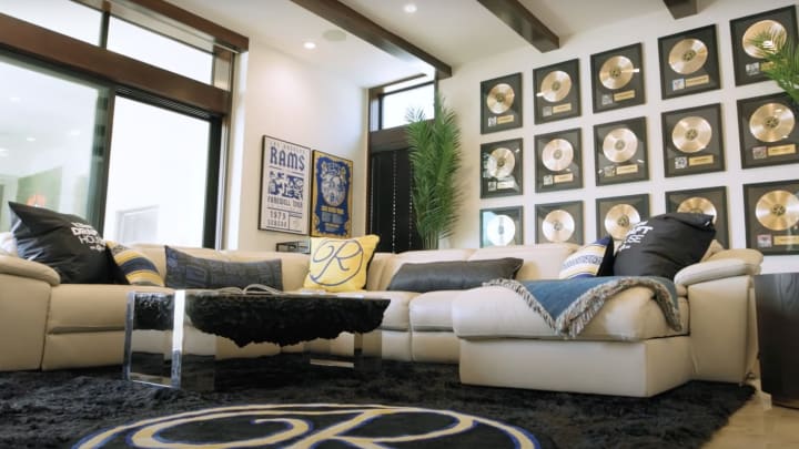Before you get judgy and start thinking that this is just some soulless corporate promotion, you know that the decor is more than just Rams chic. According to the Rams' website, "The design inspiration for the Zillow Draft House comes from the Rams' season-long theme celebrating music. Custom gold records celebrating the team's Hall of Famers and record-breakers line the walls. Photos and memorabilia from some of the most iconic musical performances from gamedays at SoFi Stadium appear along with concert posters honoring key moments in Rams' history."