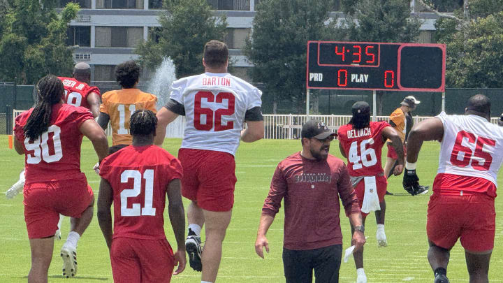 Last year, the interior line outside of Cody Mauch left a lot of size to be desired. That won't be the case this season. Although it's hard to gauge offensive linemen prior to padded practice, one of the first things that stands out about draft picks Graham Barton and Elijah Klein is just how big they are. Barton has outstanding size while Klein is a barrel-chested, broad-shouldered jolt of energy. Barton was taking all his snaps at center while Klein started off on the right side of the line. Barton's athleticism is clear to see. He has a quick burst of the snaps and twitchy explosive movement working from the interior. Klein is also better off the snap than I expected and both should be in the mix to compete for starting jobs right away. On a side note, Bucs international player Lorenz Metz is a massive human being and towers over everyone on the practice field at 6’9".