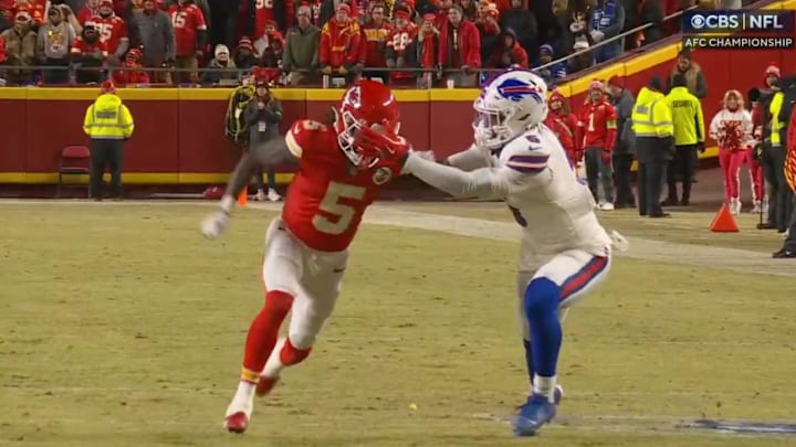 During the Chiefs' touchdown drive, Bills defensive back Kaiir Elam was flagged for a facemask penalty on Worthy, helping the Chiefs advance down the field for their second score of the game.