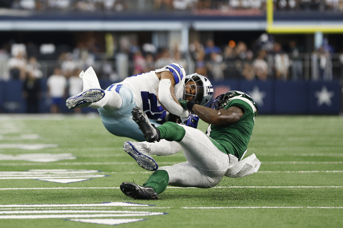 With the Cowboys facing a 3rd-and-7 from the Jets' 20-yard line, quarterback Dak Prescott hit receiver Michael Gallup for a three-yard gain out on the left flank. Jets' cornerback D.J. Reed wrapped Gallup up by the legs at the 17-yard line and began wrestling the pass-catcher to the ground.