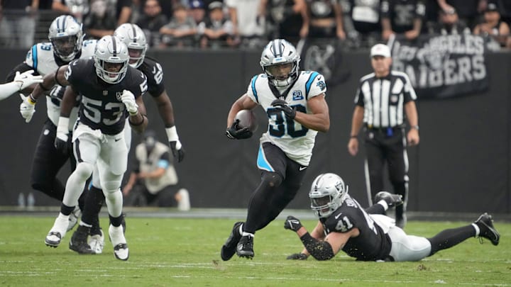Carolina Panthers running back Chuba Hubbard (30) rushes against the Las Vegas Raiders