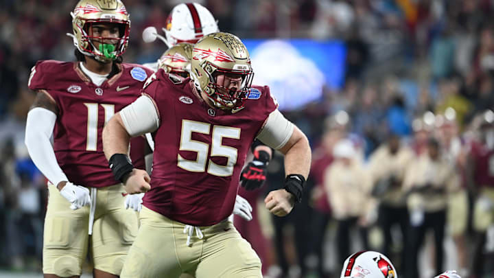 Florida State Seminoles defensive tackle Braden Fiske (55) sacks Louisville Cardinals quarterback Jack Plummer | Credit:© Jim Dedmon-USA TODAY Sports