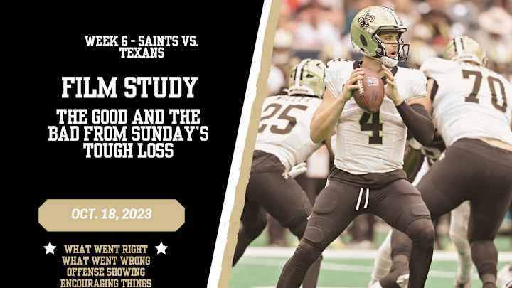 Saints Film Study vs. TexansIt wasn't all bad for the Saints against the Texans, but the consistent red zone struggles are extremely concerning.Sports Illustrated New Orleans Saints News, Analysis and More|Share on FacebookShare on XAdd us as a preferred sourceAdd us as a preferred source on GoogleFollowLoading recommendations... Please wait while we load personalized content recommendationsPublished Oct 18, 2023SPORTS ILLUSTRATED NEW ORLEANS SAINTS NEWS, ANALYSIS AND MOREShare on FacebookShare on XHome/Video