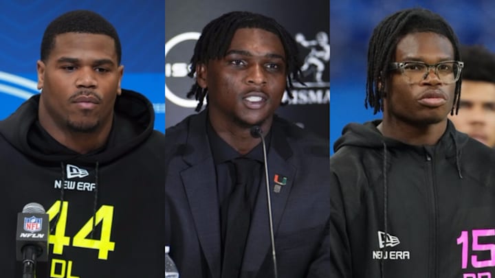 Feb 27, 2025; Indianapolis, IN, USA; Penn State defensive lineman Abdul Carter (DL44) during the 2025 NFL Scouting Combine at the Indiana Convention Center. Mandatory Credit: Kirby Lee-Imagn Images / Dec 14, 2024; New York, NY, USA; Miami Hurricanes quarterback Cam Ward speaks on stage during a press conference before the 2024 Heisman Trophy Presentation. Mandatory Credit: Lucas Boland-Imagn Images / Feb 28, 2025; Indianapolis, IN, USA; Colorado defensive back Travis Hunter (DB15) looks on during the 2025 NFL Scouting Combine at Lucas Oil Stadium. Mandatory Credit: Kirby Lee-Imagn Images