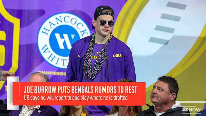 SI's Jenny Vrentas reports from the NFL Combine that Joe Burrow directly addressed the rumors of him refusing to play for the Cincinnati Bengals if they did draft him at number 1 in the 2020 NFL Draft, saying he'd be close to his parents and will play for whoever drafts him.