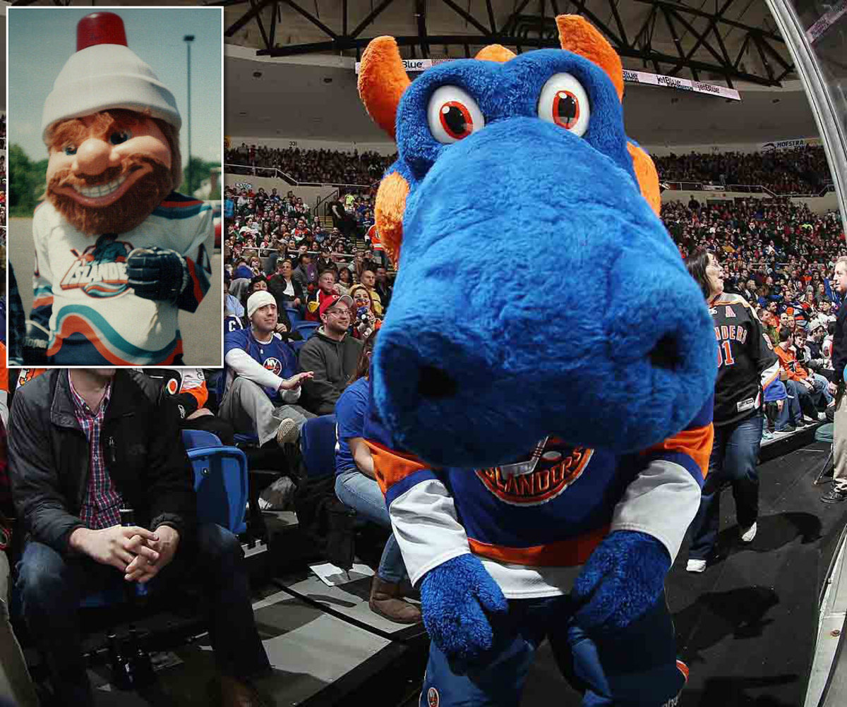 What hath a dragon to do with the Islanders? Like Montreal's Youppi!, Sparky was once employed by a team in another sport (in this case Charles Wang's NY Dragons of the Arena Football League). After Wang bought the Isles in 2000, Sparky replaced the shabby, vaguely creepy Nyisles (inset), who was supposed to be seafarer like the fisherman on the team's infamous crest of mid-90s.