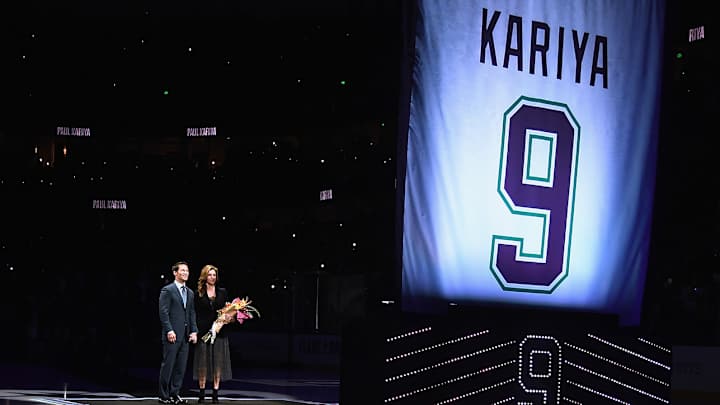 ANAHEIM, Calif. — The Anaheim Ducks raised Paul Kariya's No. 9 to the Honda Center rafters Sunday night, honoring the high-scoring forward who became a Hall of Famer.
