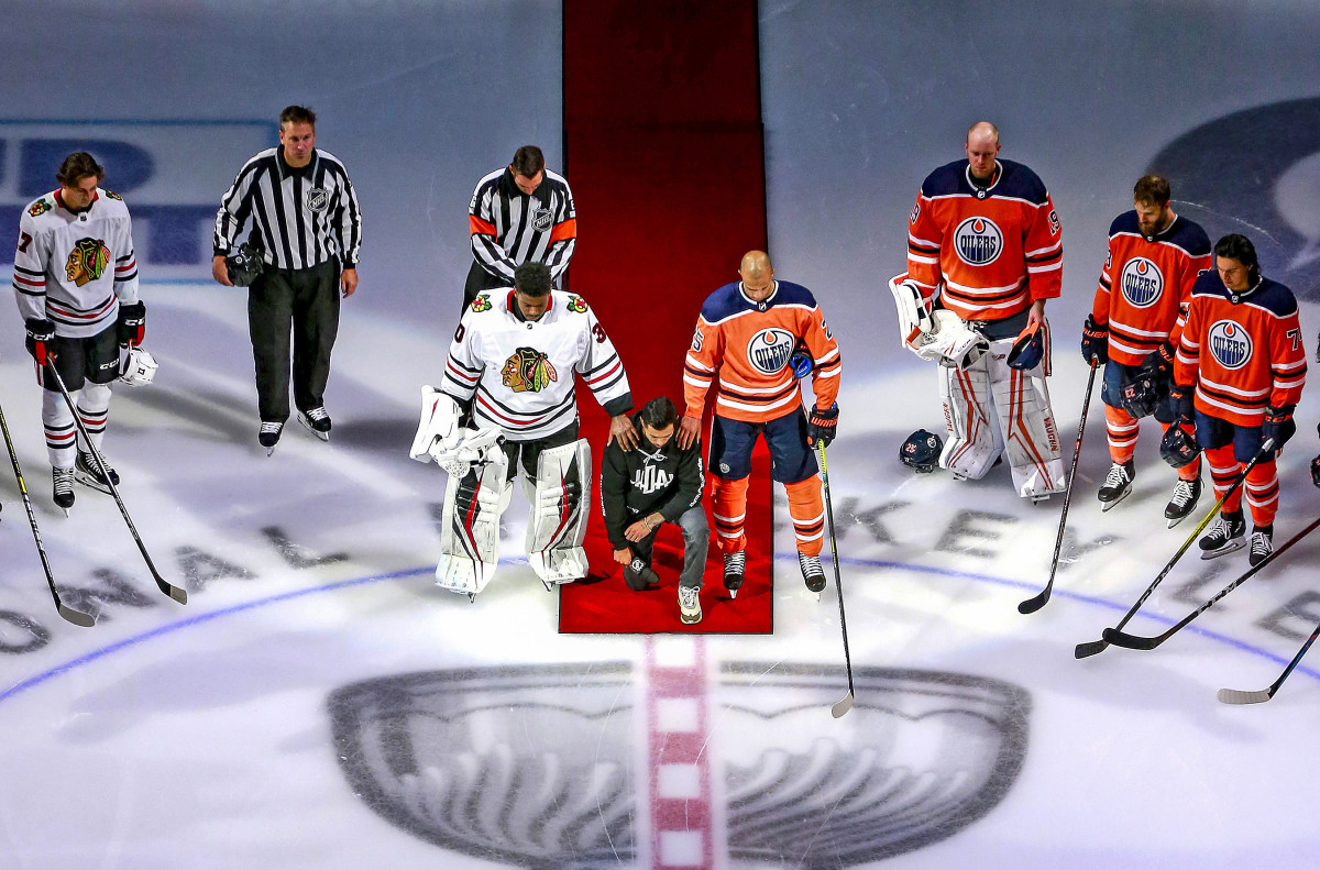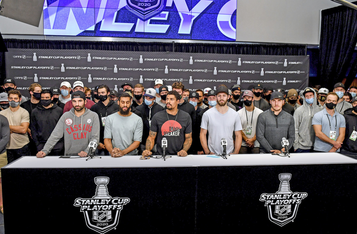 It was a sensitive moment for the league. A week earlier, after police in Kenosha, Wis., shot a 29-year-old Black man named Jacob Blake seven times in the back, player-led protests in the NBA, WNBA, MLB and MLS spawned a night of unprecedented work stoppages. The NHL, meanwhile, had continued to hold games inside its Edmonton and Toronto bubbles, provoking outrage. “[T]he lack of action and acknowledgement from the @nhl [is] just straight up insulting,” tweeted Sharks winger Evander Kane, one of the league’s few Black players. The NHL finally went dark the next day, suspending play for two nights.