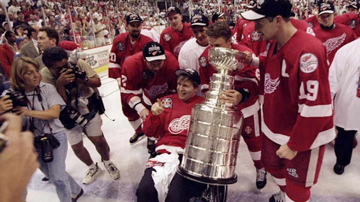 The Red Wings swept the Capitals to earn a second consecutive championship, and the first victory lap with the Cup went to former Red Wing Vladimir Konstantinov, who was tragically paralyzed the year before, never to play again.