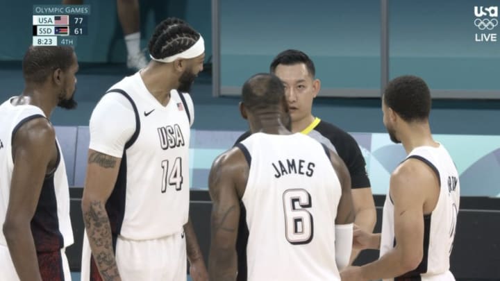 One funny moment from the victory went viral as a ref was seen explaining a questionable call to Durant, James, Steph Curry, and Anthony Davis. Those are four of the best basketball players in the world and this poor ref found himself in a tough spot.