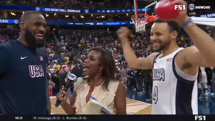 The Olympic exhibition matchup featured a thrilling alley-oop between James and Curry, among other highlights, and afterward, the two Western Conference rivals joined Fox Sports’ Kristina Pink for their first-ever joint postgame interview.