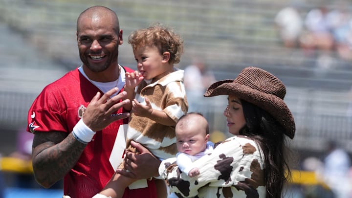 Ramos, with their newborn baby, Aurora Rayne, still less than two months old, and 1-year-old big sister, Margaret Jane Rose, better known as MJ, were on the field to hang out with the Cowboys franchise QB, who is trying to live up to his monster $240 million extension, with $231 million guaranteed.