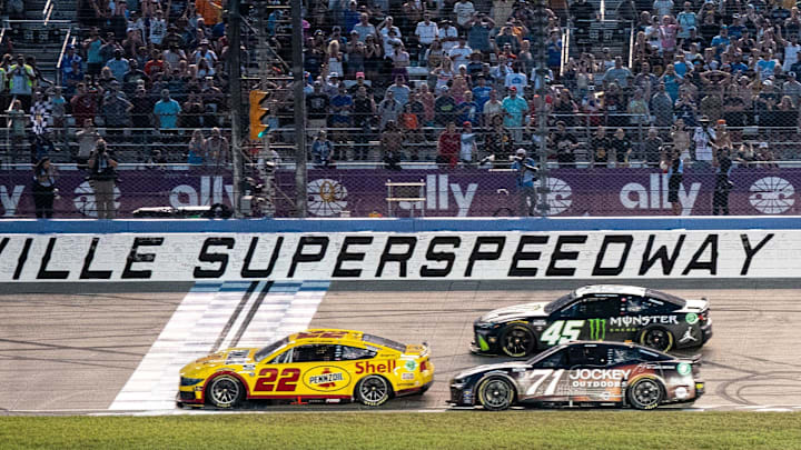 Joey Logano, the defending winner of the Cracker Barrel 400 at Nashville Superspeedway, has won the race off pit road, and he will line up alongside Todd Gilliland, the leader who stayed out under this caution, on the restart to kick off the final Stage of the race. Logano, who took four tires, gained three spots on pit road.