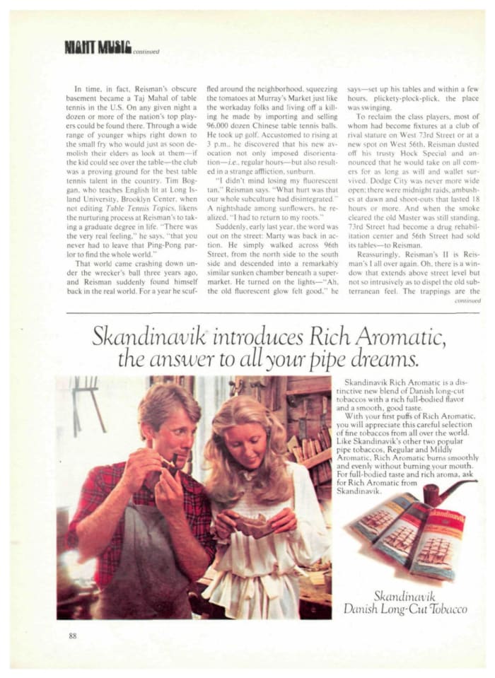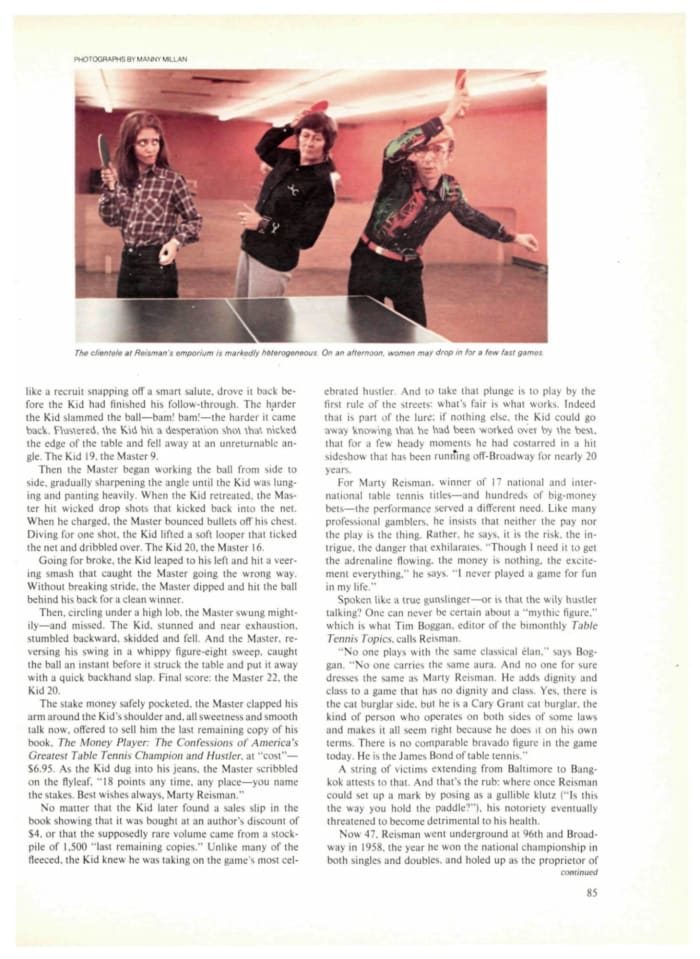 By then, the dashing Reisman, who owned several world table tennis championships, was firmly established as one of the best hustlers around. He operated out of his club on Manhattan’s Upper West Side, the Riverside Table Tennis Club, where people from all walks of life competed not only against one another but also with Reisman, who limited himself by spotting huge leads or by playing with his shoe instead of a paddle. Reisman was a character: When he played overseas exhibitions he would do anything he could to make a little extra money. “He was a hustler,” says Millan. “He smuggled gold out of Southeast Asia. He would say that he went into the country weighing 135 pounds and then he had a special coat belt to slide bars of gold in and he left the country weighing 185 pounds.”