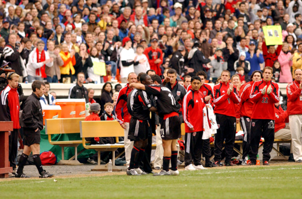 Freddy Adu gets a final pep talk from Alecko Eskandarian before making his pro debut at age 14 with D.C. United. (Joe Murphy/MLS/Getty Images)