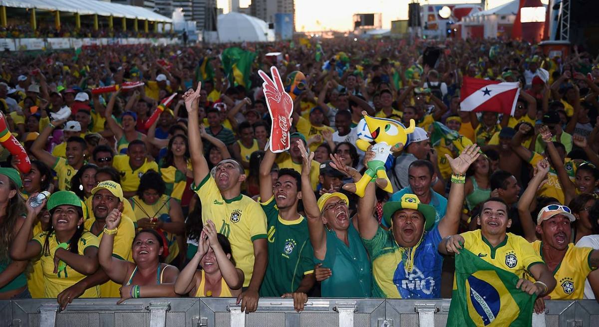 Brazilian fans enyoy the music as the sun sets during the 2014 FIFA World Cup Fan Fest Kick off Event on June 8, 2014 in Fortaleza, Brazil.