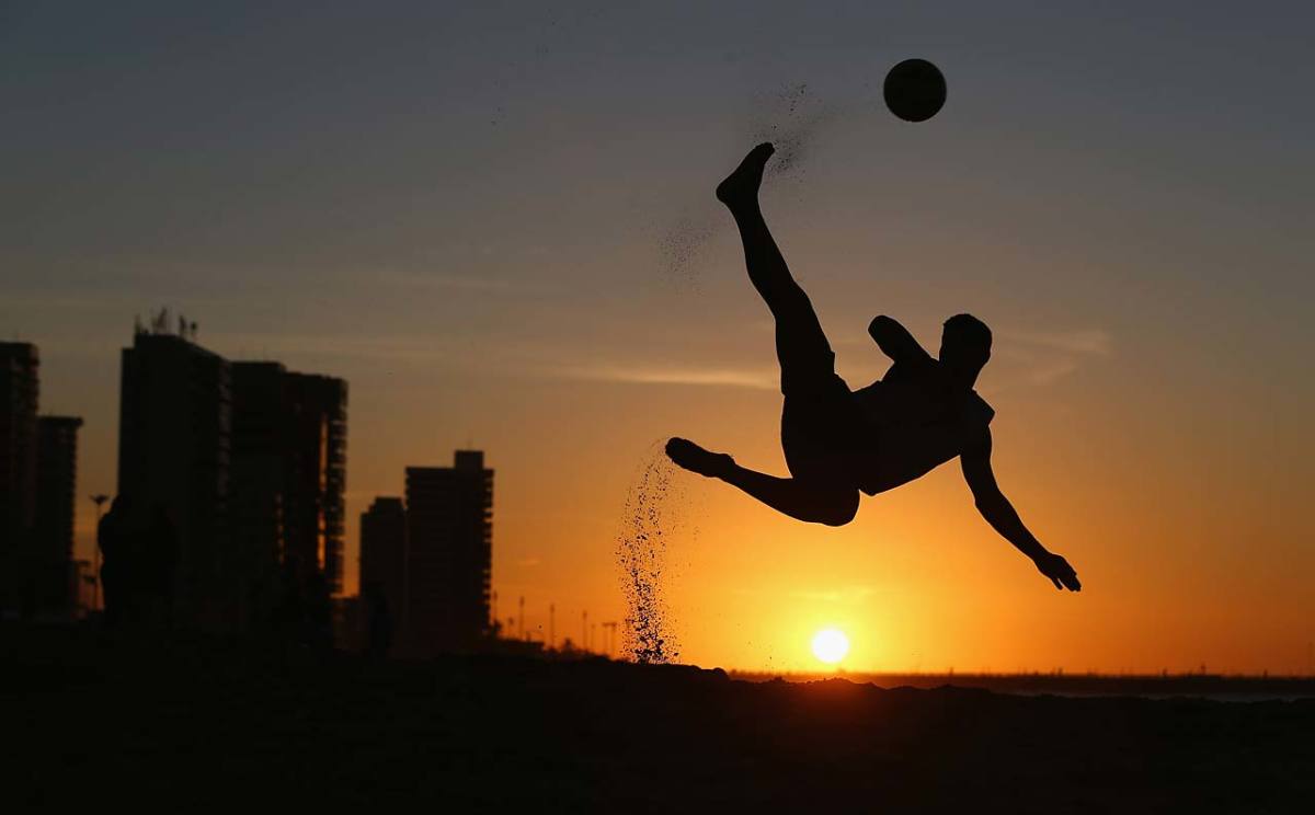 A local boy shows off his beach football skills on Magna Praia beach on June 11 in Fortaleza, Brazil.