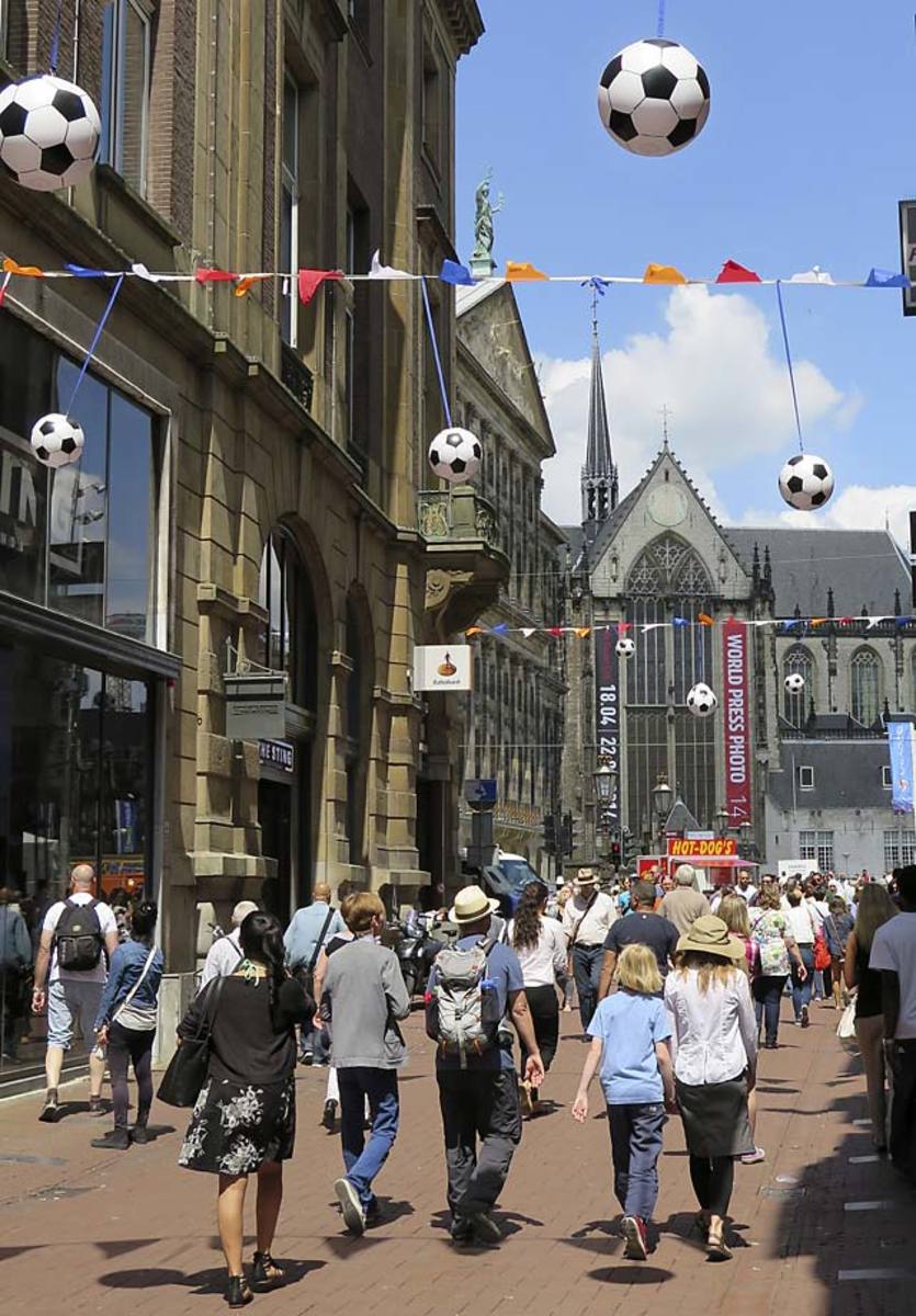 People walk under World Cup soccer decorations in the Kalverstraat in the center of Amsterdam, June 12. The Netherlands plays its first World Cup Group B match against Spain on Friday June 13.