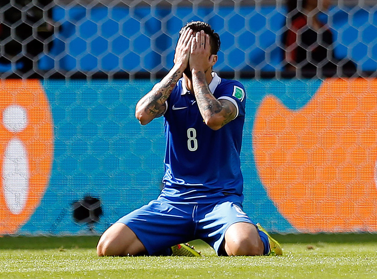 Greece's Panagiotis Kone reacts after missing a chance duringa 3-0 loss to Colombia.