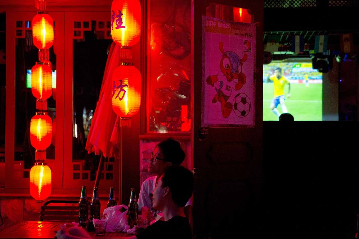 Chinese soccer fans watch the opening match of the 2014 World Cup between Brazil and Croatia, at a bar in Beijing, China.