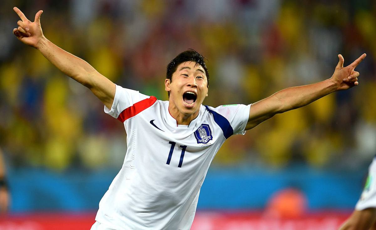 Lee Keun-Ho of South Korea celebrates after scoring the team's first and only goal in a tie with Russia.