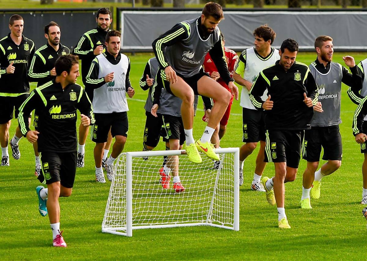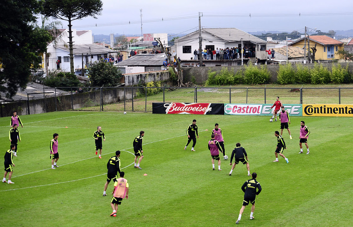 Spanish national team players attend a training session at the Atletico Paranaense training center in Curitiba, Brazil, on June 10.