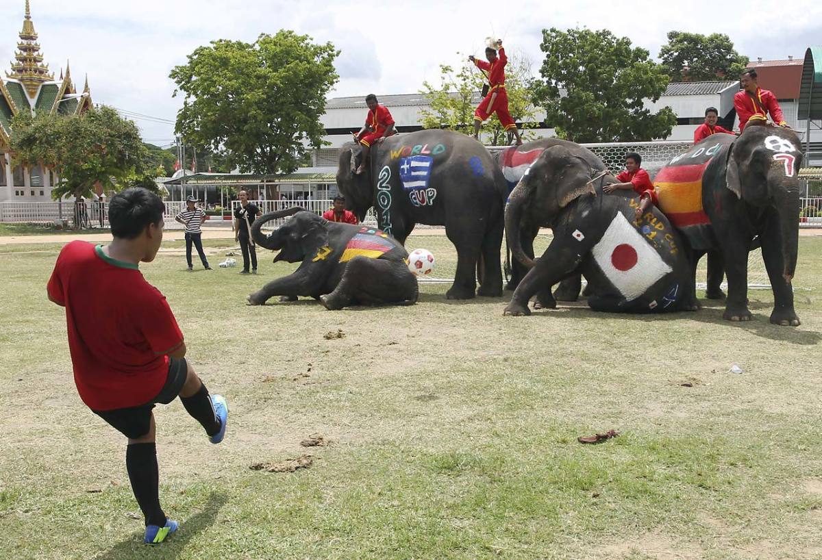 A Thai youth kicks the ball as five elephants block the goal during a soccer match between men and elephants on Monday, June 9, organized by Ayutthaya Elephant Camp to celebrate the World Cup soccer tournament.