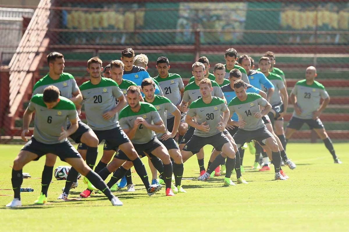 Socceroo players stretch during an Australian Socceroos training session at Arena Unimed Sicoob on June 9 in Vitoria, Brazil.