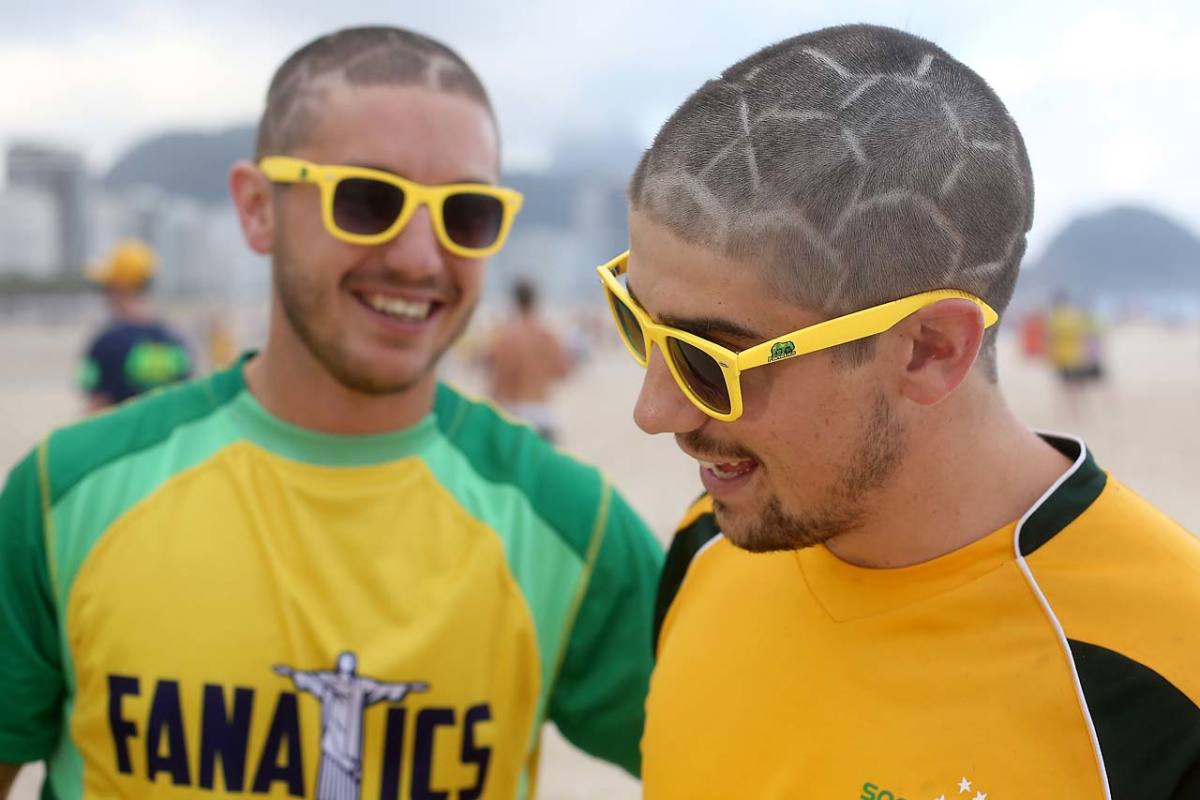 Two Australian football fans show off their football style haircuts at Copacabana beach on June 11.